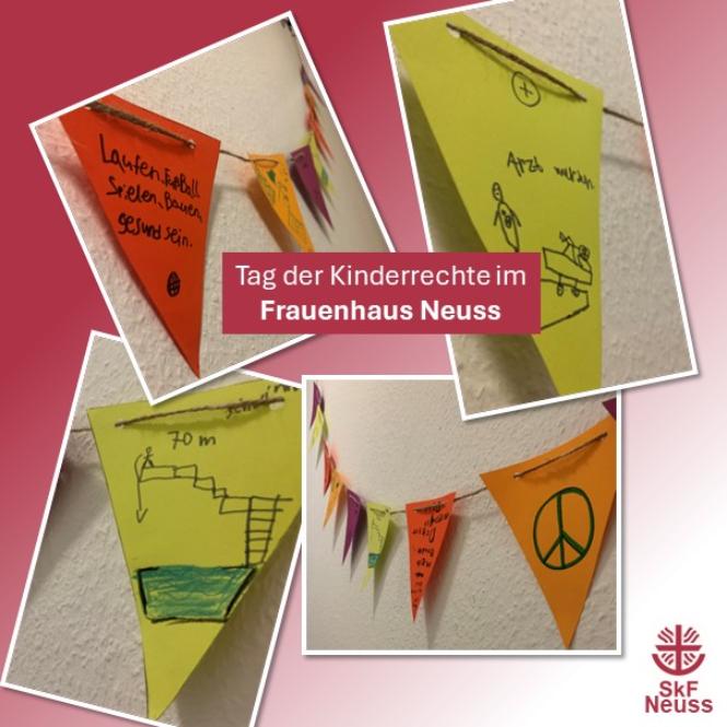 Im Frauenhaus Neuss werden auch die Rechte der Kinder groß geschrieben. Anlässlich des heutigen Tages der Kinderrechte, bastelten die Kinder eine Wimpelkette, mit Rechten die ihnen am Herzen liegen: Arzt werden, Fussball spielen, Gesund sein, Bauen, vom 70m Brett springen, Frieden.