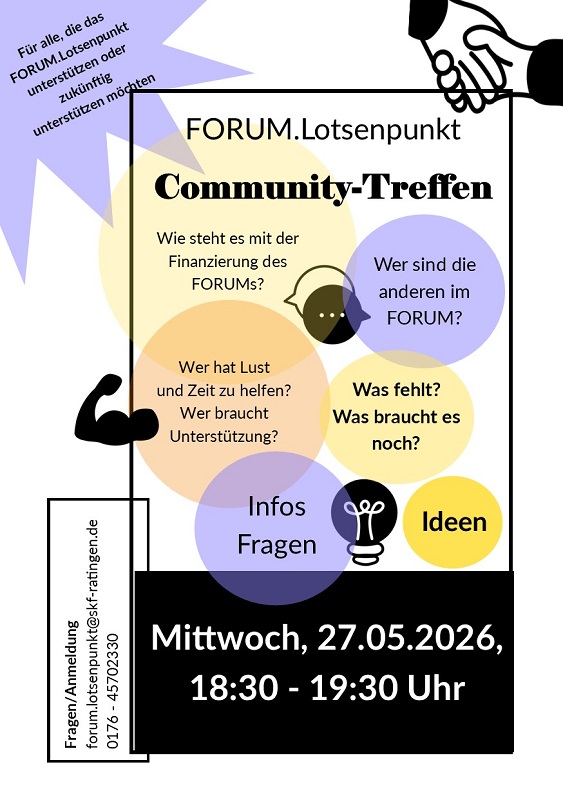 Das FORUM.Lotsenpunkt ist ein Gemeinschaftsprojekt des SkF e.V. Ratingen, des Caritasverbands im Kreis Mettmann und der katholischen Pfarrgemeinde St. Peter und Paul in Ratingen.